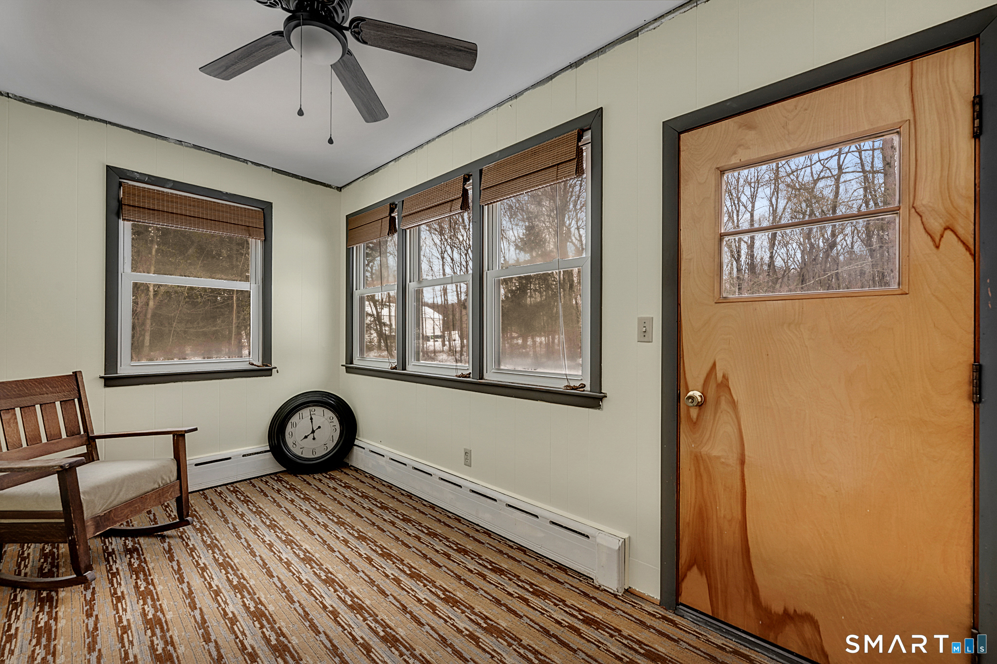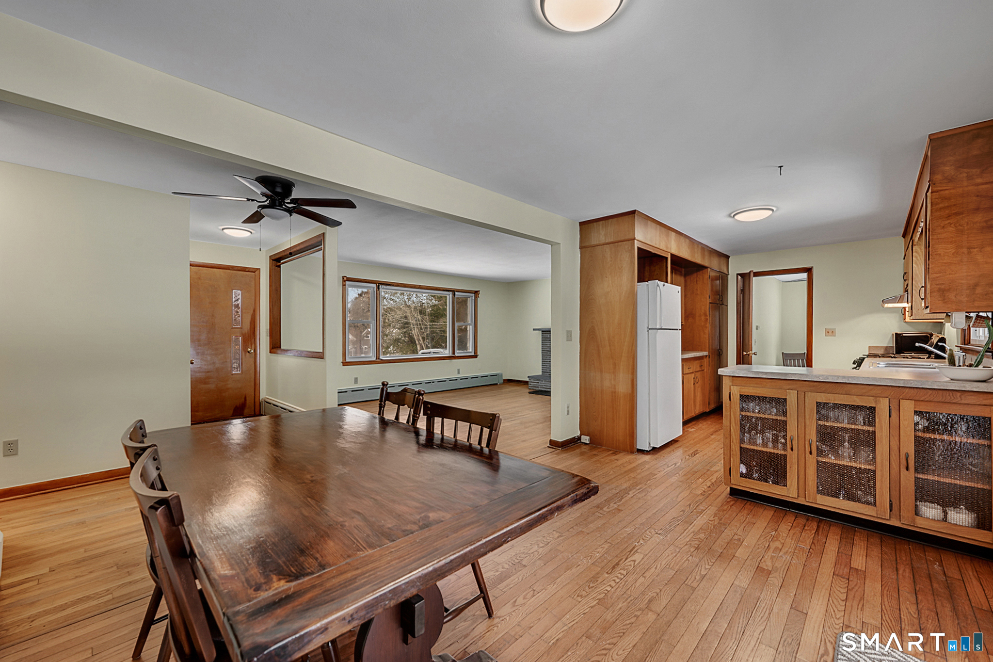 Welcome to 25 East Street in Bethlehem, a well-maintained 1966 home offering charm, functionality, and flexible living space. A stone paver walkway and bluestone entry set the tone as you step inside to hardwood floors throughout and an open floor plan ideal for everyday living and entertaining. The living area features a wood-burning fireplace with a stone surround and slate mantel, complemented by plentiful cabinetry and natural light. The home includes a spacious dining room with built-in shelving and ceiling fan, a full bath with large vanity and hallway linen closet, and three generously sized bedrooms. The primary en-suite bedroom easily accommodates a king-sized bed and offers baseboard heat, a good-sized closet, and a private half bath with ceramic tile floors and walls. A heated sun porch/mudroom off the attached one-car garage adds valuable year-round space. Downstairs, the high-ceiling basement provides excellent finishing potential and includes workbenches, a sink, and a 13x20 finished bonus room with fireplace, built-in cabinetry, tile flooring, baseboard heat, cable hookups, and drop ceiling. Additional highlights include a recently replaced sliding door to a formerly screened-in rear deck, new Bilco doors, full attic access through the garage, oil heat, well and septic, and a large, level, fully fenced backyard-perfect for outdoor enjoyment.