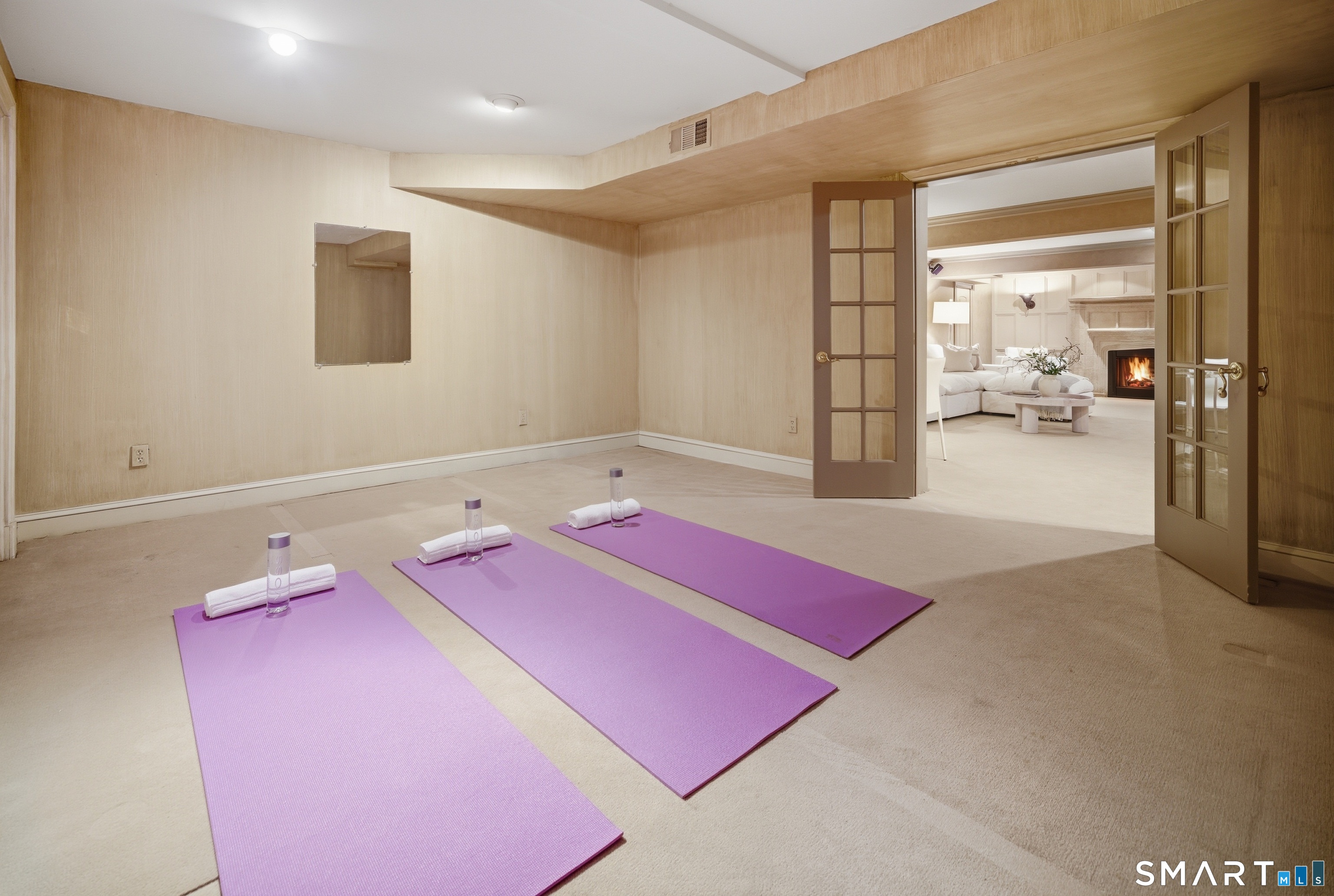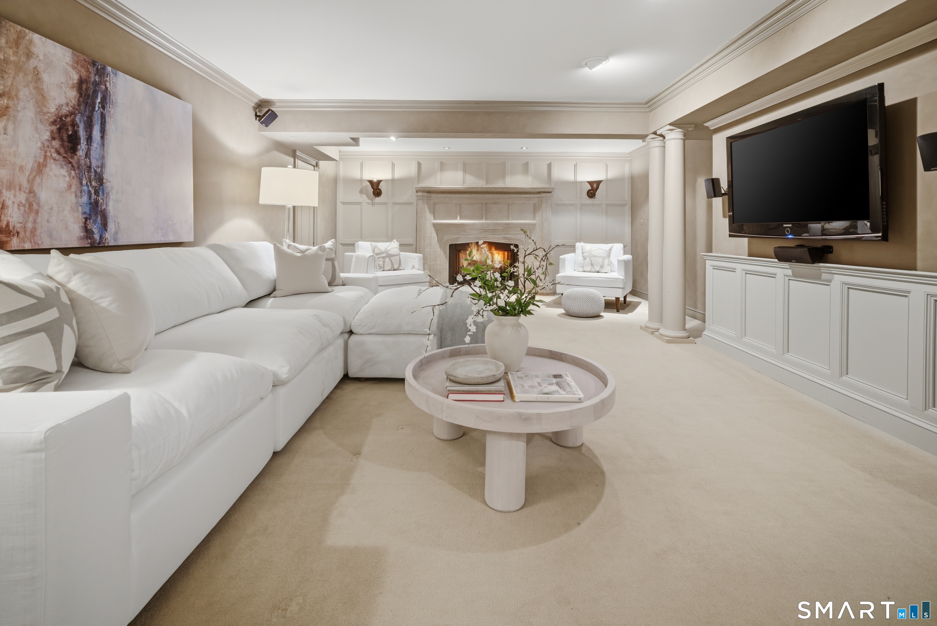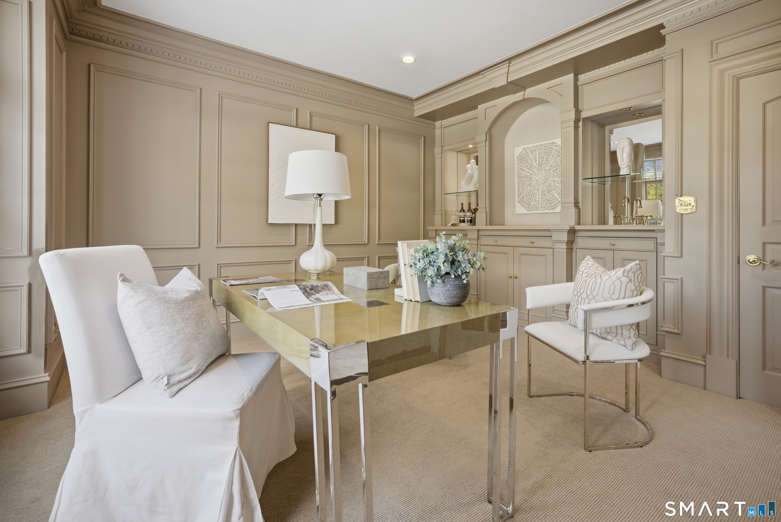 Located within a private and beautifully maintained enclave in Fairfield, 106 Stillson Road offers refined, turnkey living that truly feels like a single-family home-with the ease of condo ownership. From the moment you enter, the dramatic two-story foyer sets the tone, showcasing elegant millwork, elevated finishes, and a stunning central staircase. Just off the foyer, a richly detailed study features custom built-ins and a wet bar-ideal for working from home or entertaining. The main level continues into a warm and inviting family room with a wood-burning fireplace and direct access to a private, oversized patio. At the heart of the home, a light-filled dining room with a wall of windows connects seamlessly to the open kitchen, equipped with Viking appliances, an eat-in area, pantry, and easy access to the two-car garage. Upstairs, the expansive primary suite is a true retreat, featuring double-door entry, a fireplace, dual walk-in closets with custom storage, and a spa-like bath with soaking tub, glass-enclosed shower, double vanities, and water closet. Two additional bedrooms each offer en-suite baths, including one with brand-new wall-to-wall carpeting, a walk-in closet, and a lofted bonus space perfect for a home office or reading nook. A dedicated laundry room completes the second floor. The finished lower level is designed for entertaining and relaxation, featuring a media room with built-ins and gas fireplace, a dedicated gym space and abundant storage.