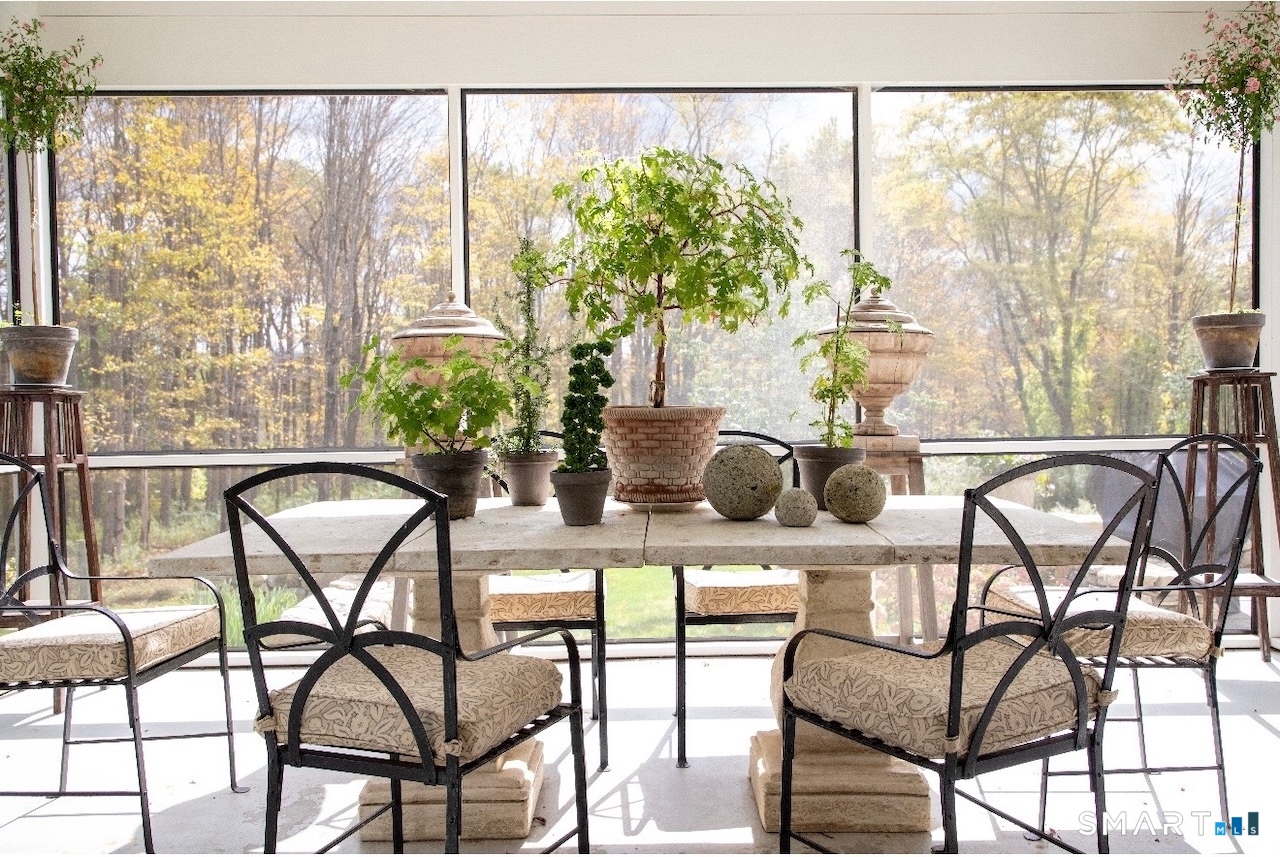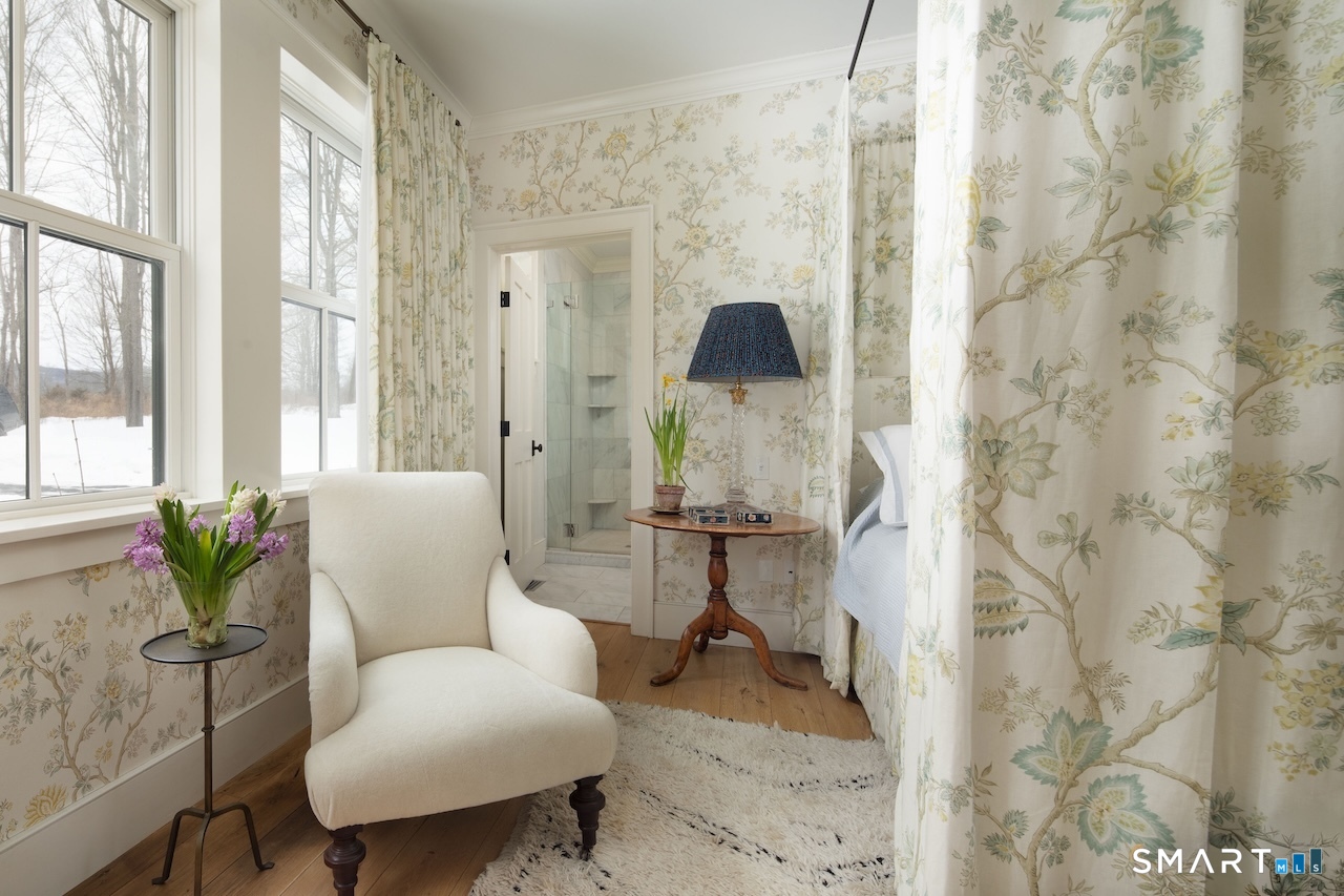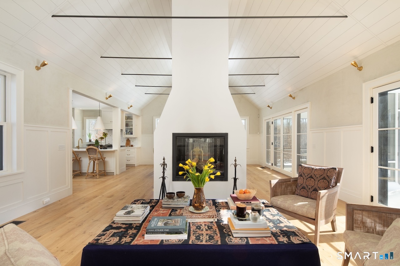 Set on three pastoral acres in a private setting, this modern farmhouse offers timeless craftsmanship paired with thoughtful contemporary design. The four-bedroom, three-and-a-half-bath residence is beautifully proportioned for both refined entertaining and comfortable everyday living. A light-filled open floor plan is anchored by a chef's kitchen featuring a Lacanche range and custom butler's pantry, designed to support both daily living and elevated entertaining. The kitchen flows seamlessly into expansive living and dining areas, centered around a striking double-sided wood-burning fireplace. Southwest-facing French doors open to a serene screened-in porch and adjoining bluestone patio with a built-in fireplace, creating an effortless connection between indoor and outdoor living. A stunning library with custom-built-in shelving and cabinetry provides an elegant retreat for work or quiet moments. The primary suite offers a private sanctuary designed for rest and relaxation, featuring a beautiful light-filled bedroom and spa-like bath that blend sophistication with a calm, restorative ambiance. The second floor includes three additional bedrooms and two full baths, offering well-balanced space for family and guests. Additional highlights include a one-car garage with a private second-floor apartment featuring a full bath and kitchenette-ideal for guests, extended family, or a home office.