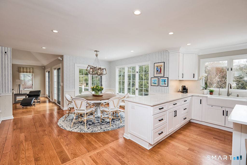 Located on a quiet cul-de-sac in the heart of Westport, this beautiful timeless Colonial is located at the top of one of the town's most picturesque streets, directly across from the scenic Saugatuck River. The gourmet kitchen features island seating, custom cabinetry, a serving peninsula, and a breakfast room with an abundance of natural light. The front-to-back living room with fireplace and high ceilings is adjacent to the kitchen and is also the heart of the home. Two recently renovated (Trex) decks off the kitchen and living room, along with an expansive terrace, overlook the private backyard-perfect for entertaining and outdoor enjoyment. All bedrooms are located on the second level along with two fully renovated baths. The lower level includes a family room, home gym, full bathroom and a lot of storage. The lower level has potential for a fifth bedroom. Offering 3,674 sq ft of finished living space, 23 Harborview Rd provides both comfort and flexibility, with additional unfinished space to expand within the existing footprint, if desired. Additional highlights include natural gas, public water and sewer, central air, two-car garage with room for storage, and new blue stone front walk. Commuters will appreciate the south of the Post Rd location, just 1.8 miles to the Westport Station. Harborview offers a walkable lifestyle-minutes to town 'over the foot bridge' to the library, Farmer's market, Levitt Pavillion, and restaurants. Audio/Visual