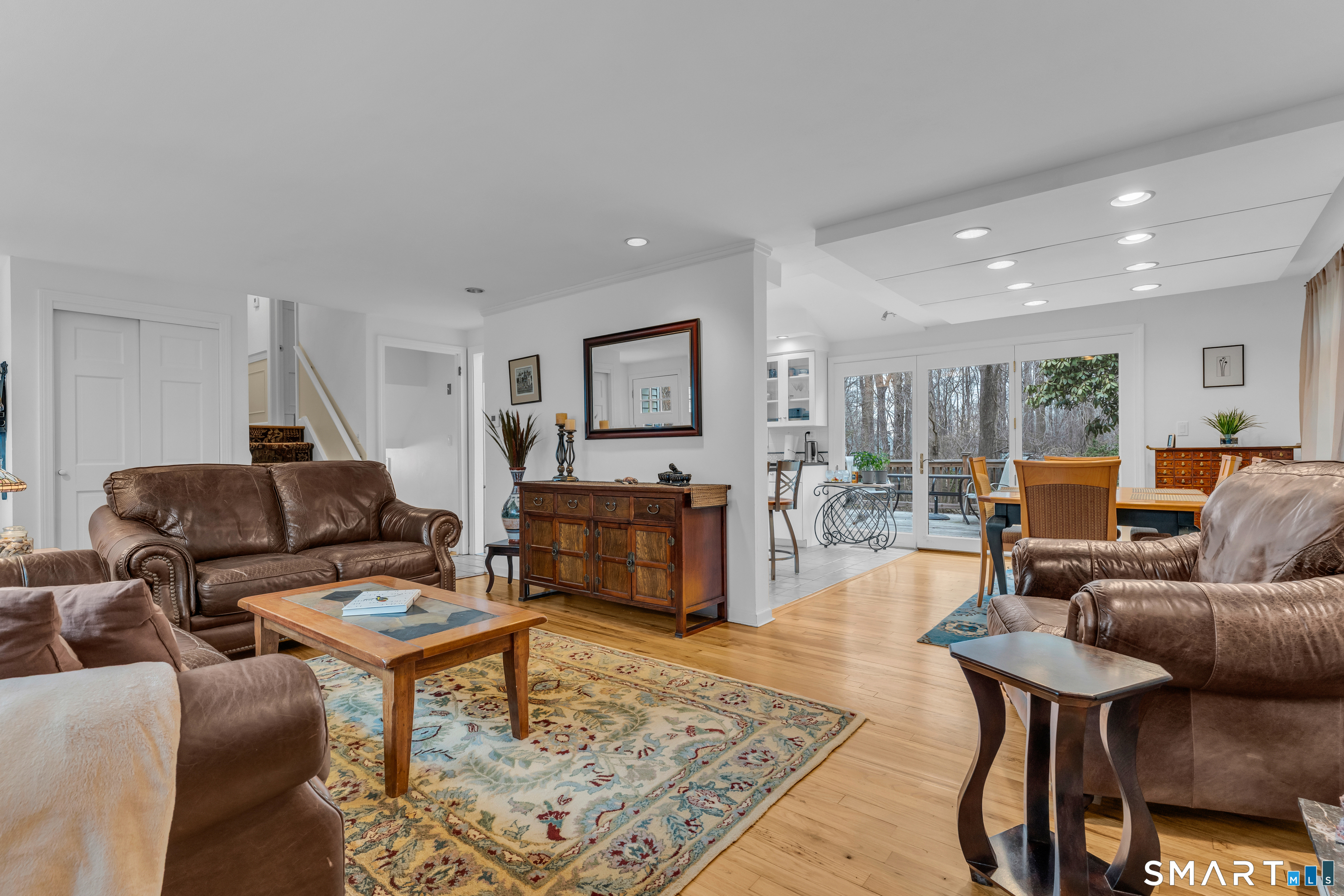 Welcome to this spacious and inviting home set on nearly an acre of level property in a desirable and convenient Guilford location. Offering 3-4 bedrooms and 2 full baths, this home features multiple living spaces and thoughtful updates designed for comfortable everyday living. The main level includes a bright living room with a gas fireplace that opens to a sunny breakfast area and a large updated kitchen with stainless steel appliances, a breakfast bar, skylights, and vaulted ceilings that fill the space with natural light. Sliders lead to a multi-tiered deck overlooking the level backyard with a shed, electric fence, and doggie doors through the mudroom for easy access for furry friends. Upstairs, three bedrooms share a spacious main bath featuring a soft-jetted tub, walk-in shower, and skylight. Two levels offer beautiful hardwood floors, while the lower level adds a large family room with French doors to a private backyard patio, a remodeled full bath with walk-in shower, and a separate office or potential fourth bedroom with another skylight. This level also includes laundry and a mudroom connecting to the garage with EV charging station. Equipped with natural gas baseboard heat and an additional split system for cooling. Ideally located just minutes from I-95, Guilford's Town Green, beaches, shops, restaurants, and the train station, offering the perfect blend of space, comfort, and convenience.