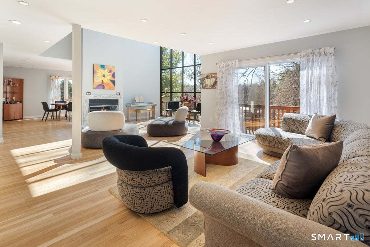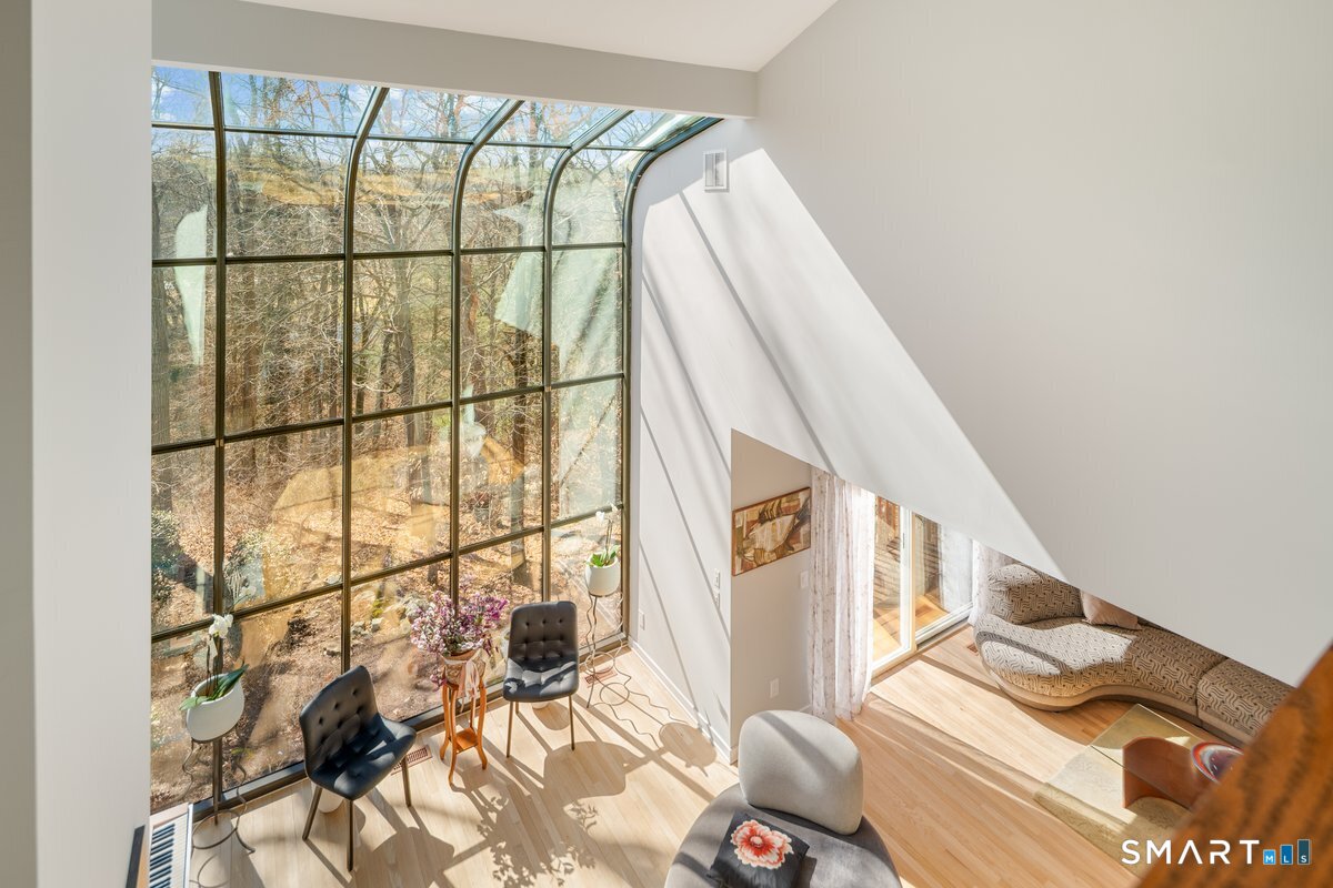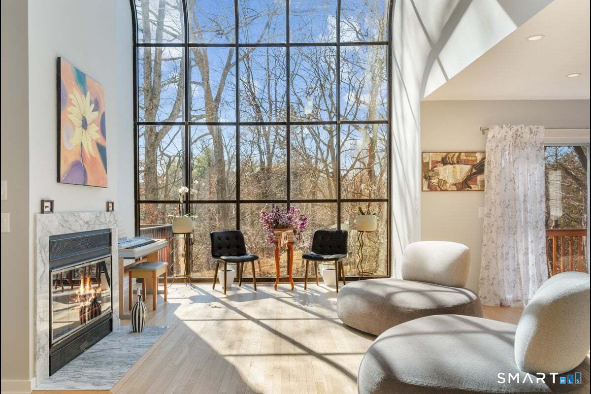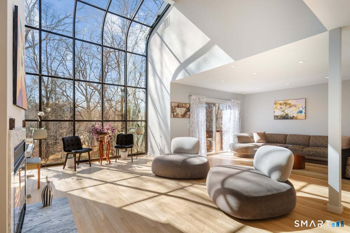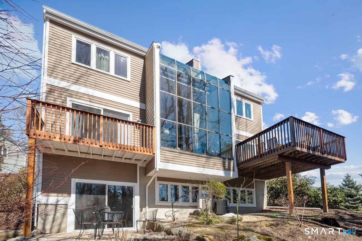 Found in the heart of historic Silvermine, The Falls is Norwalk's premier gated community of free-standing townhomes. The two story atrium window is the focal point of this home. Additionally, there is a wood burning fireplace, sliders to three decks and a patio - step outside from all three levels! The large main floor living room allows for versatile use of the space. There is also a formal dining room, eat-in-kitchen, remodeled powder room and private office. Hardwood floors recently refinished and new tile in the kitchen and in the two story foyer with palladium window. The open second floor landing provides an addiotnal vantage point to enjoy the natural light and view provided by the atrium window. The Primary Suite features a spa-like bath, large walk in closet plus a balcony. Two additional bedrooms, additonal full bath and laundry room complete the second level. Newer wall to wall carpet throughout the second level. Beautifully finished lower level has a wall of full sized windows and sliders to a private patio. The interior and exterior have both been recently painted. The pool will be open before we know it!!