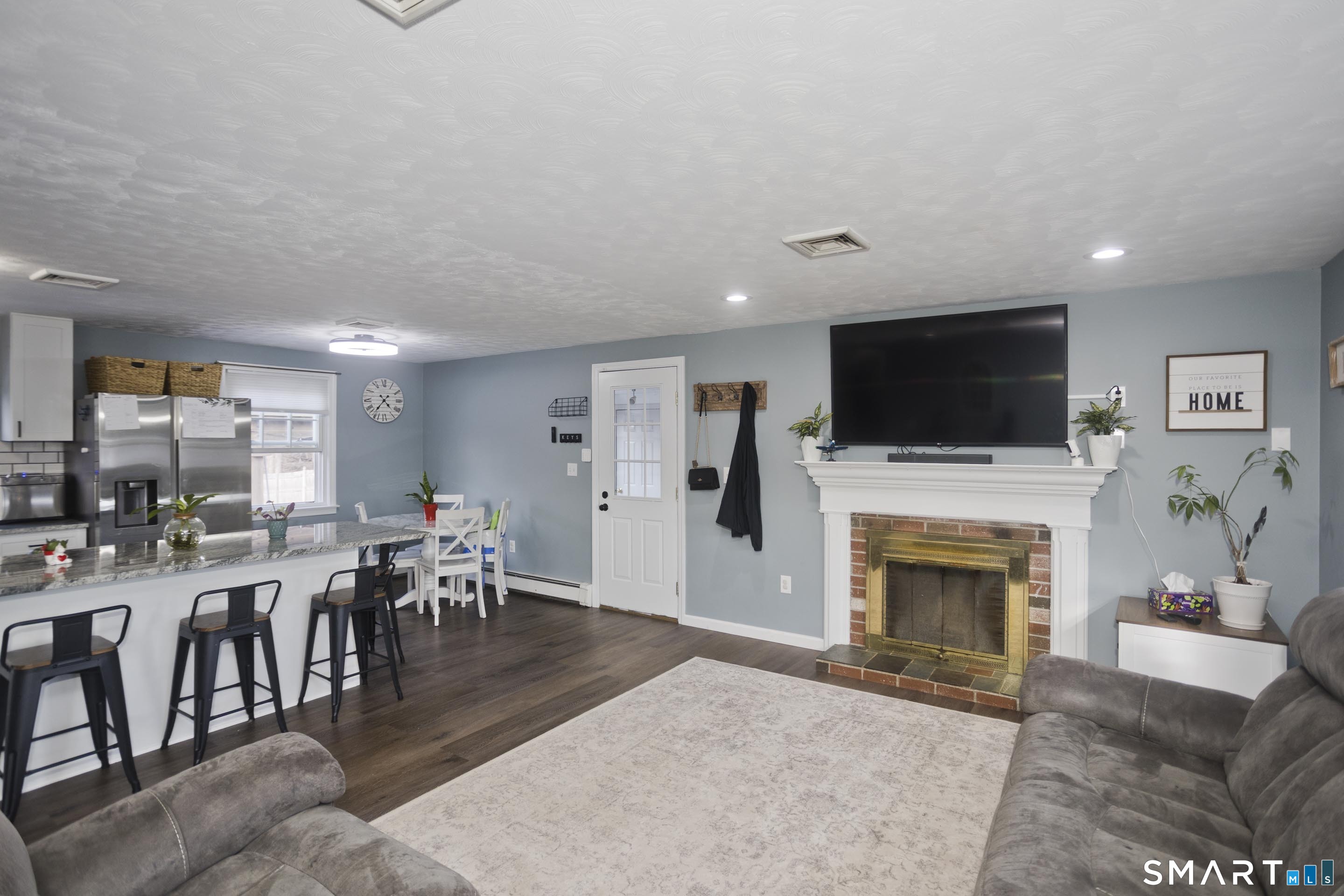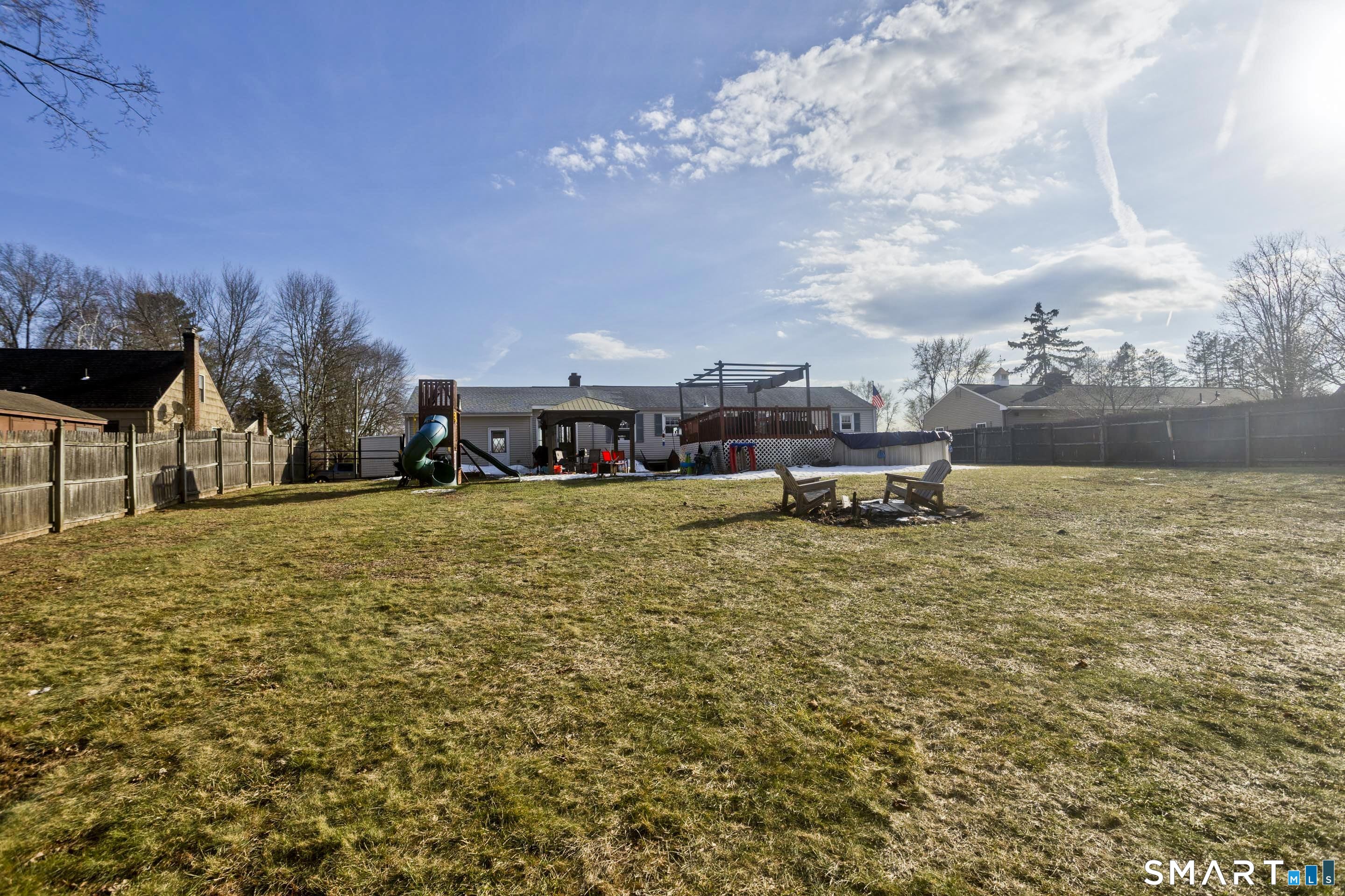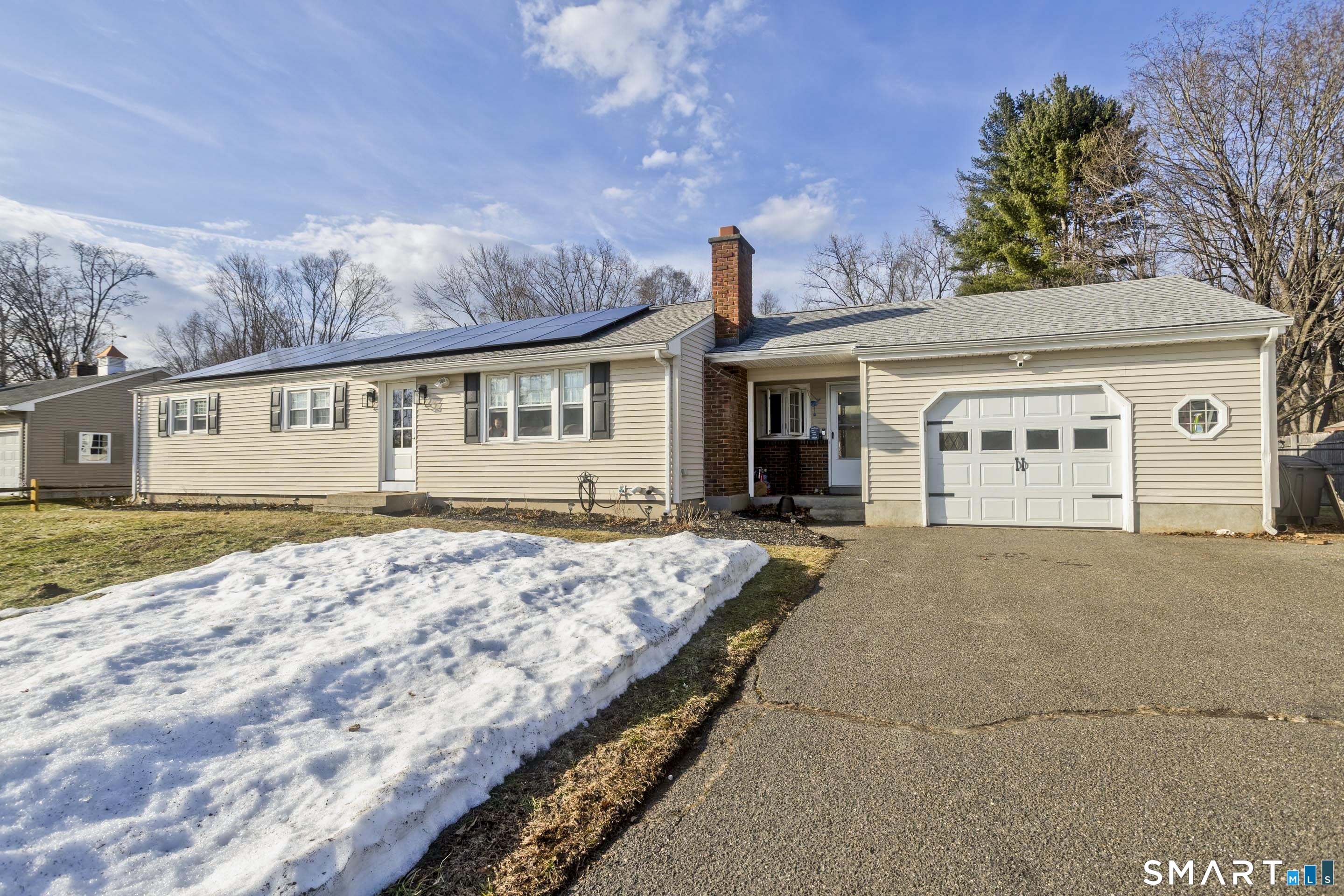 Welcome home to this well-maintained four-bedroom, two-bath ranch located in the desirable Southwood Acres neighborhood of Enfield. Step inside to the updated eat-in kitchen featuring new appliances and a large center island, perfect for cooking and gathering. The spacious open-concept living room is filled with natural light, highlighted by recessed lighting and a cozy fireplace that creates a warm and inviting atmosphere. Four generously sized bedrooms and a full bathroom complete the main level. The partially finished basement offers additional living space, ideal for a playroom, home gym, or den, along with a second full bathroom for added convenience. Outside, enjoy a large, flat, fully fenced-in backyard that offers plenty of space to relax or entertain. The outdoor area features a gazebo, an above-ground pool with a deck, and ample room to enjoy the outdoors. The home also includes a one-car garage for added convenience. Additional highlights include central AC, a gas boiler (APO 2022), new gas water heater (APO 2026), owned solar (APO 2026), 200-amp electrical service (APO 2026), and a Level 2 car charger (APO 2025). Move right in and start enjoying everything this home has to offer-this turnkey property is ready and waiting for its next owners!