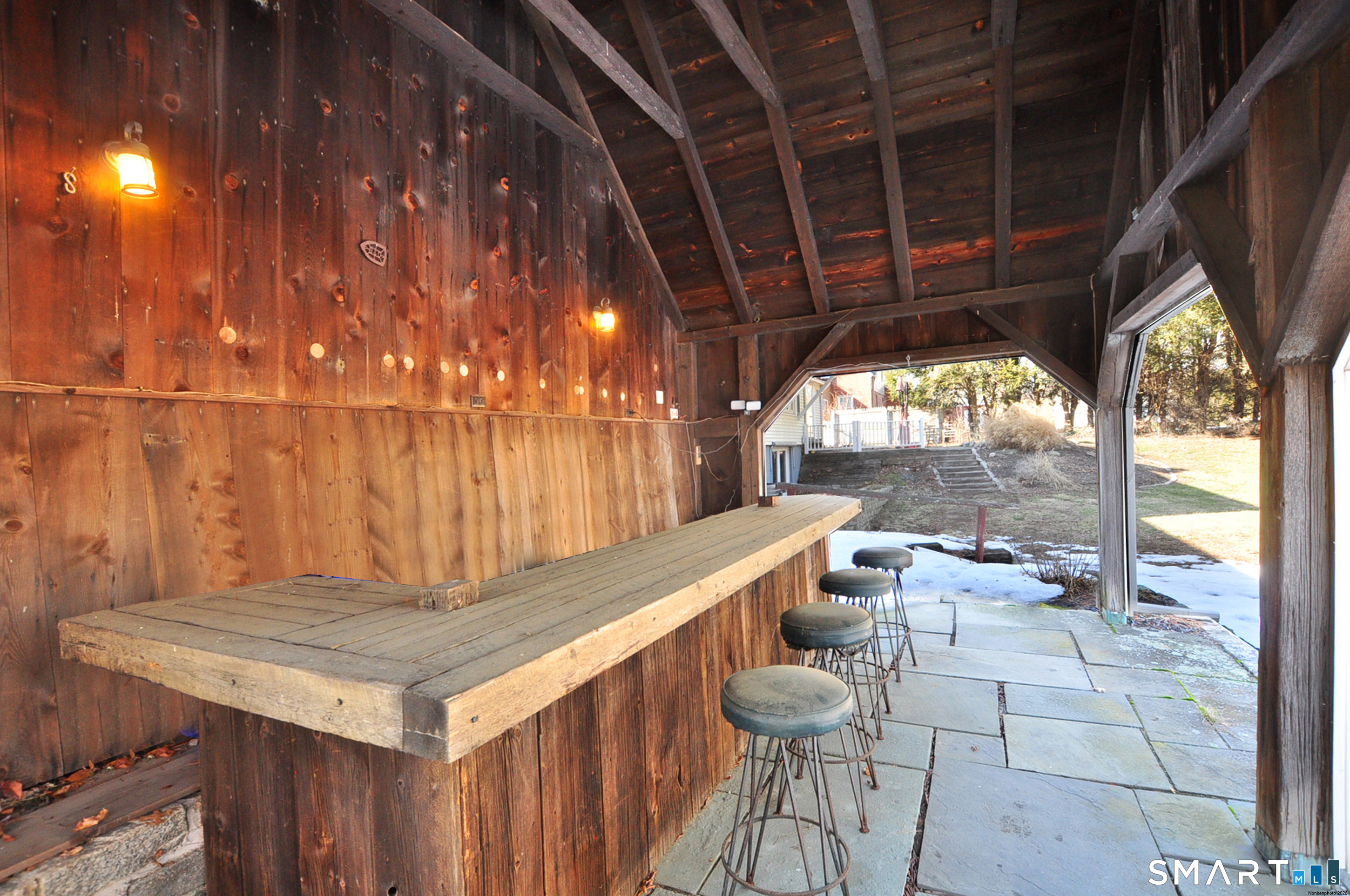 Freshly painted with refinished first-floor hardwood floors, this exceptional home offers space, character, and unforgettable amenities throughout. The kitchen features granite countertops, stainless steel appliances, and a breakfast bar, opening to a bright dinette with a bow window for everyday dining. The formal dining room is ideal for entertaining, complete with twin built-in hutches and a striking stone fireplace. The dramatic living room showcases cathedral ceilings, French doors, a gas fireplace, and sliders to a bluestone patio for easy indoor-outdoor living. A first-floor office or bedroom, plus an additional den, offers flexible space for guests, remote work, or everyday living. Upstairs, the primary bedroom features cathedral ceilings, skylights, built-ins, and a private balcony overlooking the beautifully landscaped yard. The lower-level in-law suite is perfect for multigenerational living, offering its own living room with fireplace, kitchen, bedroom, and a spa-like bath with a two-head open tile shower. Additional highlights include a large walk-in attic for abundant storage, a sun-filled greenhouse for gardening or relaxing, and a one-of-a-kind outdoor entertaining area with barnwood walls and a 13-foot bar. Enjoy views of your private tennis court while hosting in this truly special setting. Central air and a newer natural gas furnace complete this impressive home.