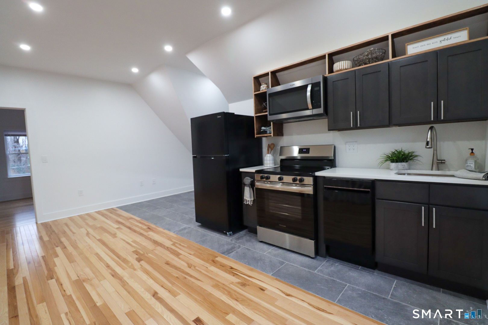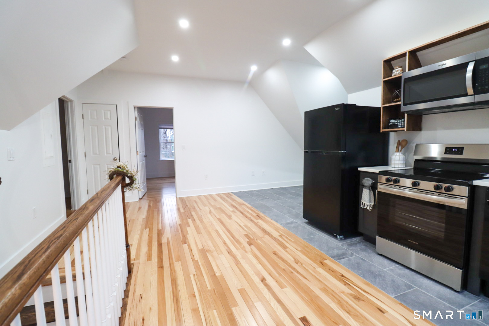 A charming entryway and staircase create a warm, inviting first impression, leading into this gorgeous 2-bedroom, 1-bathroom apartment. This bright, sun-filled space features blonde hardwood floors, a beautifully tiled bathroom, and a sleek kitchen with Corian countertops and stainless steel appliances, including an electric range, refrigerator, dishwasher, and microwave. Brand new windows bring in plenty of natural light, complemented by plenty of lighting and dimmable fixtures throughout. Central air and shared laundry add everyday convenience. Perched on the top floor, this unit offers a stunning private deck-perfect for relaxing, entertaining, or enjoying the open sky. Pet friendly. Conveniently located within 10 minutes of Electric Boat, I-395, I-95, the Naval Submarine Base, Lawrence + Memorial Hospital, Connecticut College, and Mitchell College. This is not your typical rental-everything is brand new and thoughtfully finished.